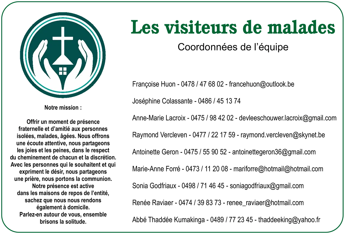 Les visiteurs de malades sont des représentants de la communauté chrétienne auprès de nos frères et sœurs malades, isolés ou âgés. Ils visitent régulièrement ces personnes et leur proposent de recevoir, s’ils le désirent, la communion au Pain de Vie. Ils veulent vivre la parole de Jésus dans l’évangile de Matthieu 25,36 :